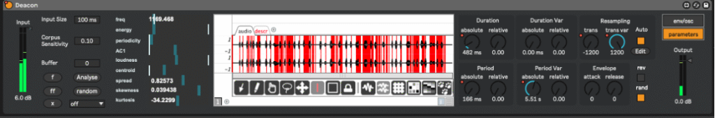 Deacon is a Mad for Live concatenative synthesis audio generator that I use in lots of my works. It is implemented in using the MuBu toolbox and operates as an audio effect that generates new sounds in response to incoming sound (e.g. other performers).